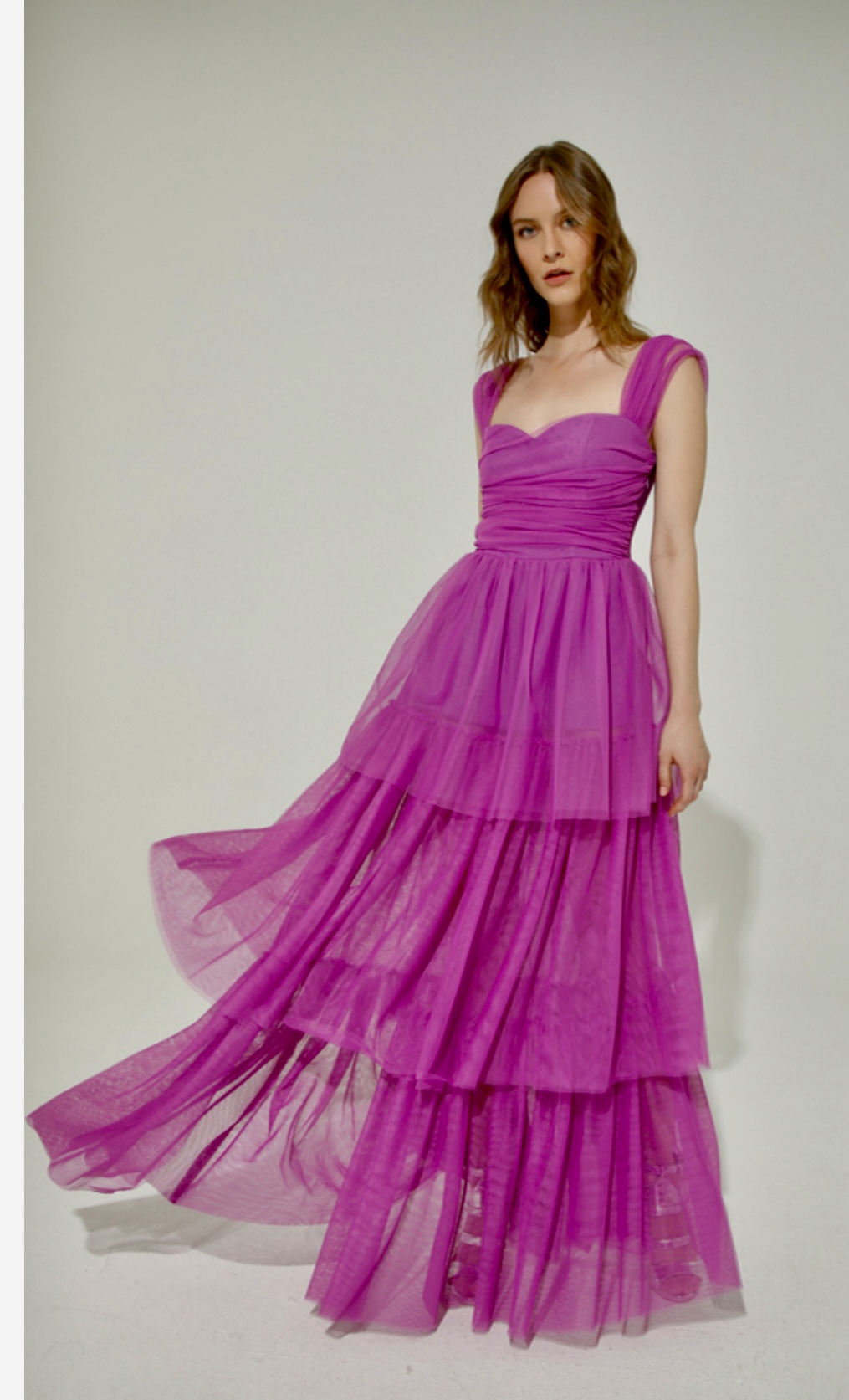 Abito lungo in tulle è una creazione poetica che fonde insieme eleganza e giocosità.Realizziamo in morbido tulle,il vestito pres