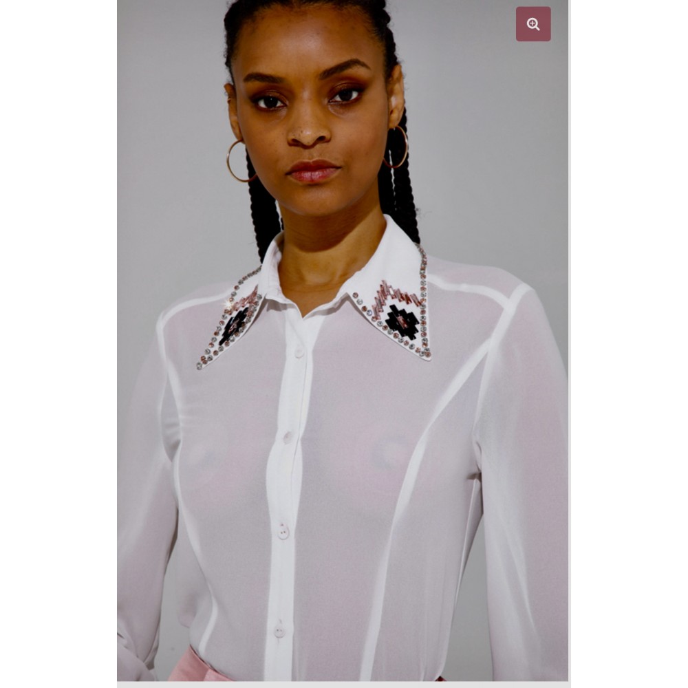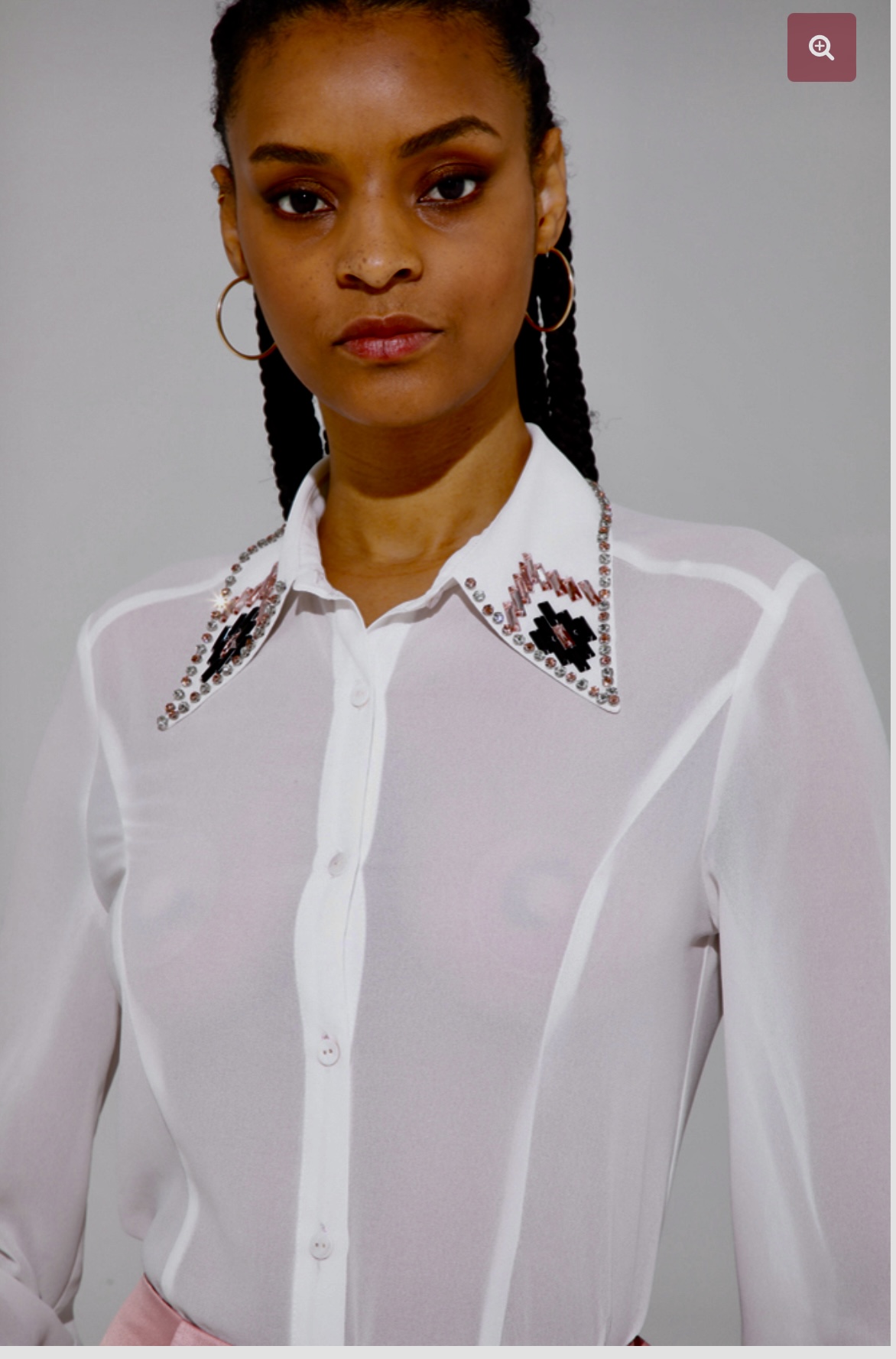 Questa camicia in chiffon incarna l'essenza della raffinatezza femminile con un tocco di originalità.Le maniche lunghe e il delicato colletto sono impreziositi da un intricato ricamo fatto a mano ,ornato con cabochon e pietre scintillanti che aggiungono un tocco di lusso