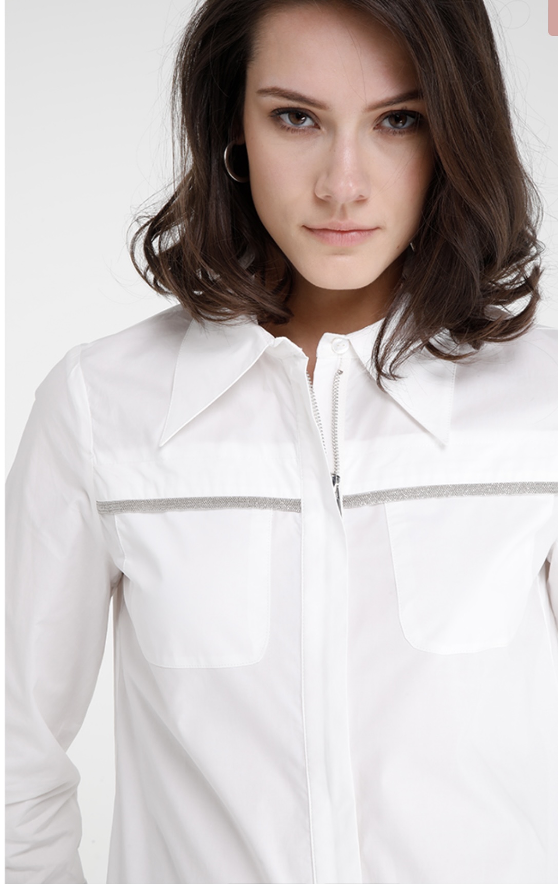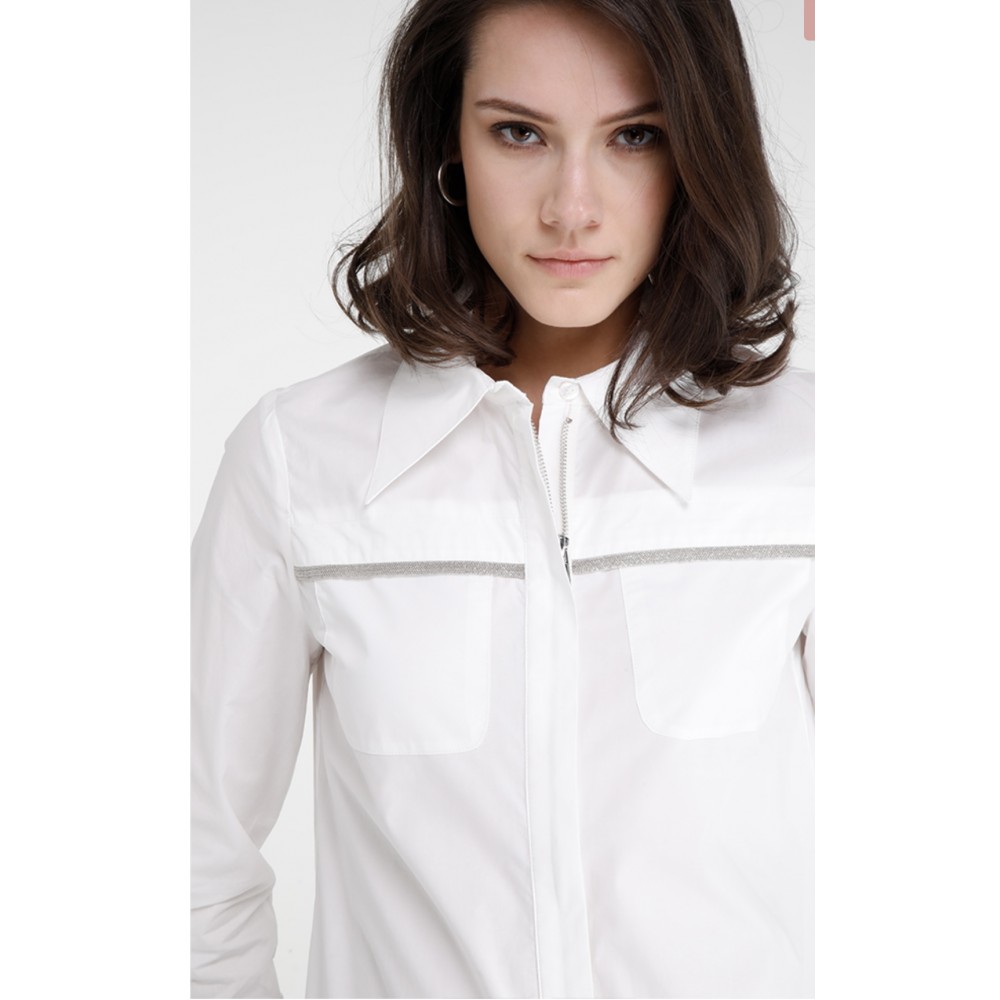 Camicia bianca in cotone popeline con tasconi frontali, passamaneria gioiello e cerniera, REF: KAST. Questa elegante camicia è r