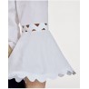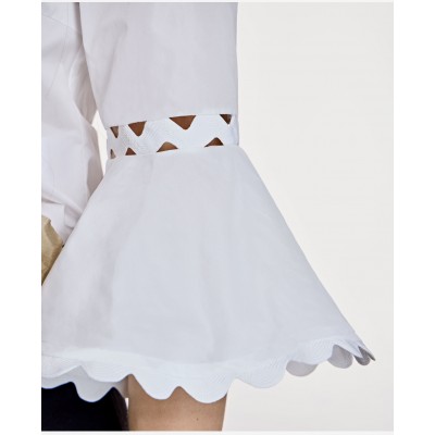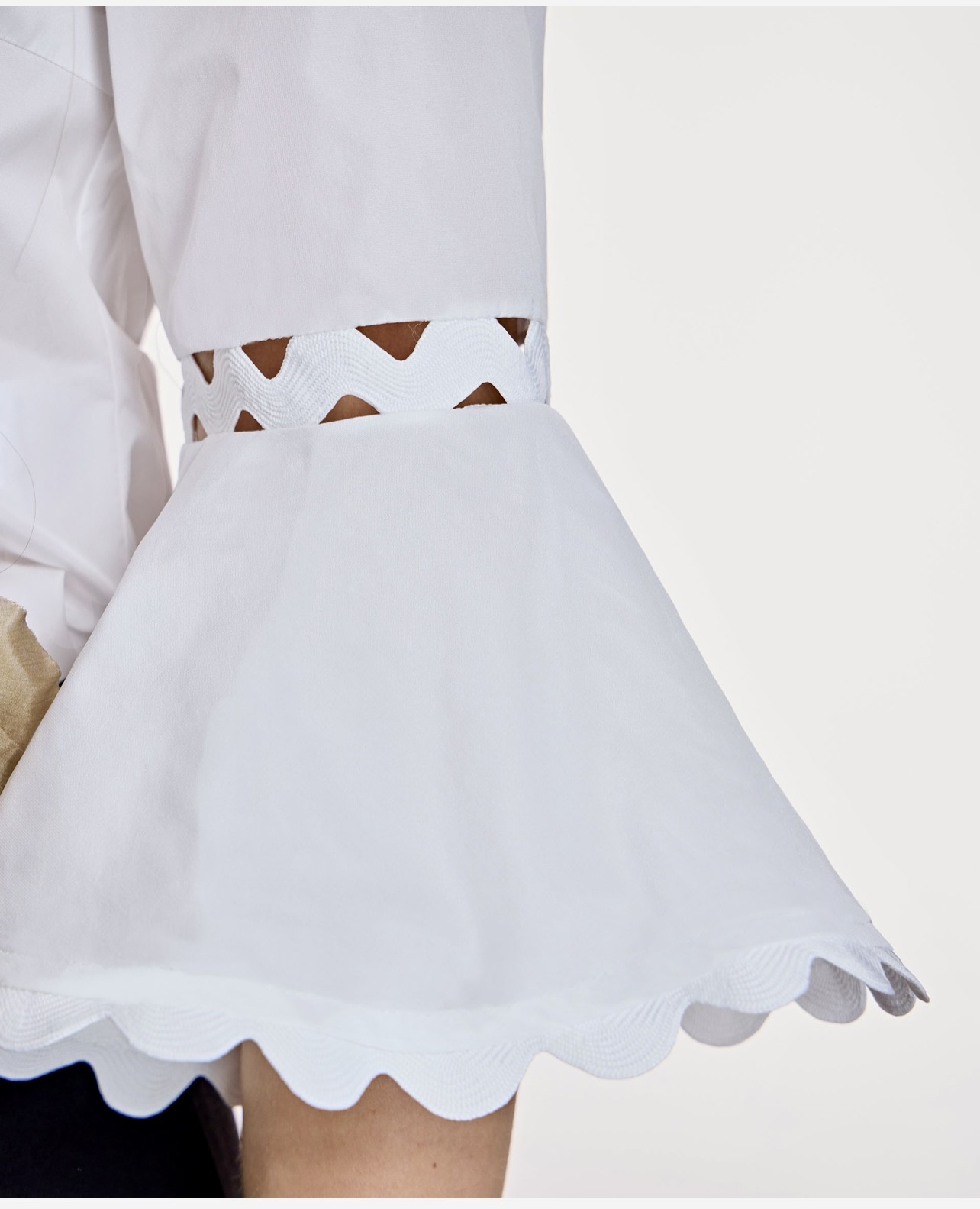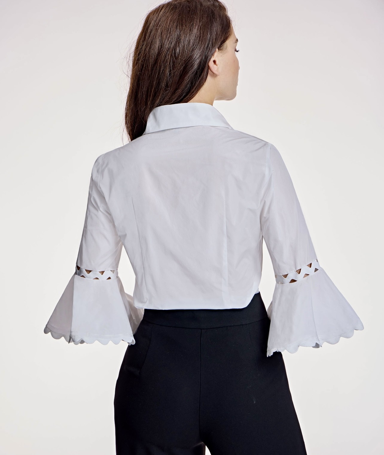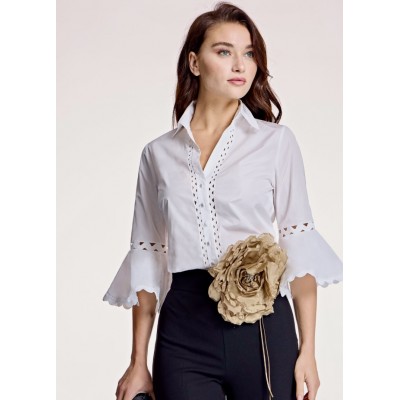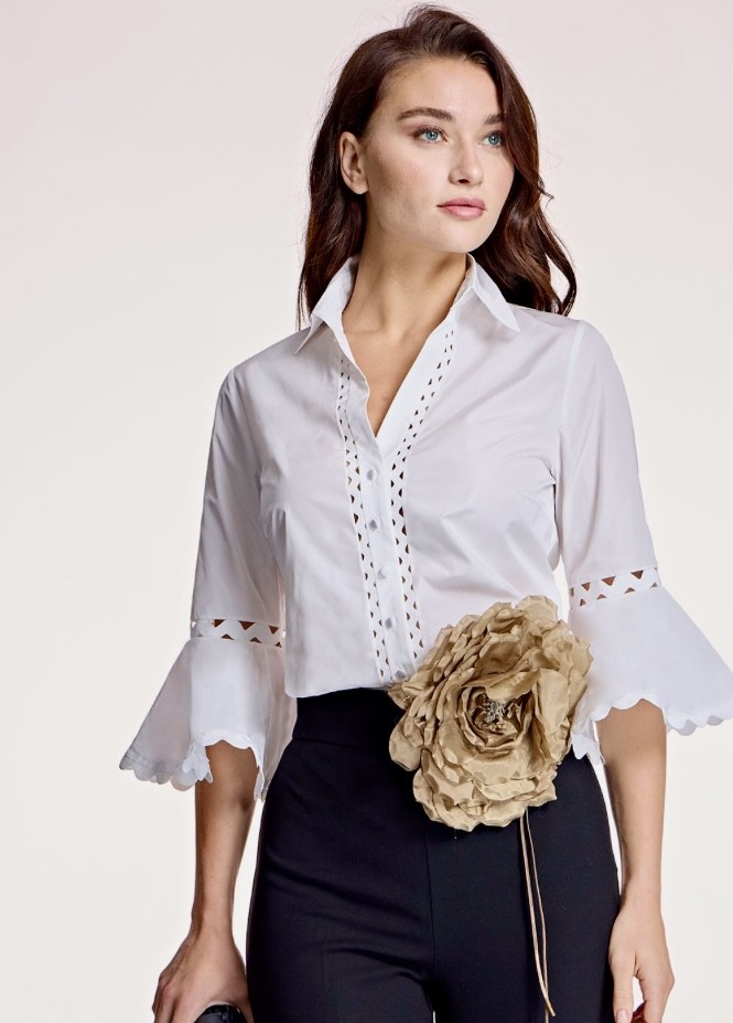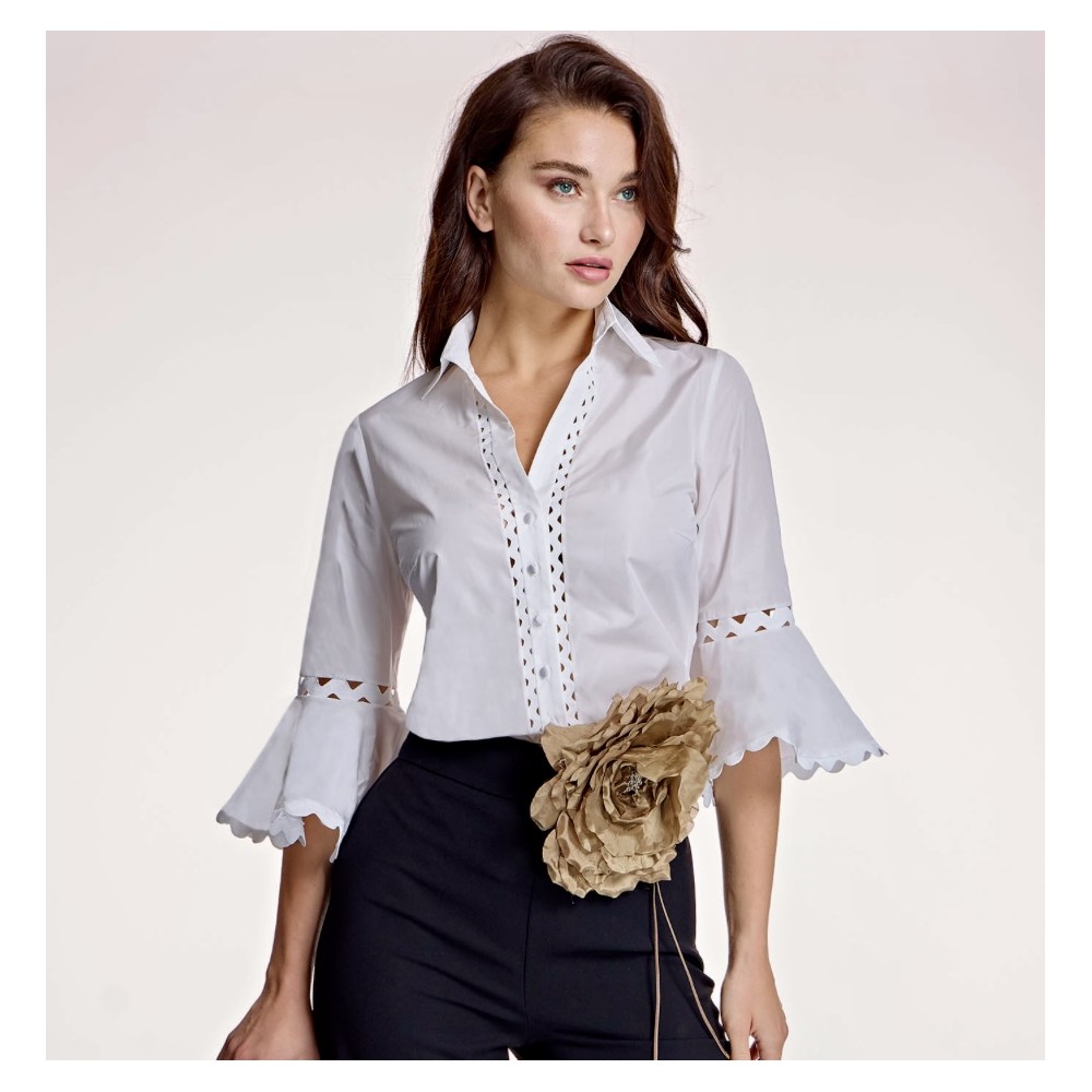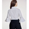 Camicetta aderente con inserto ondulato abbinato. Questo modello presenta un colletto a revers, uno scollo a V, un davanti abbottonato e maniche a tre quarti che terminano con un volant. Fondo dritto. Fiore non incluso.
