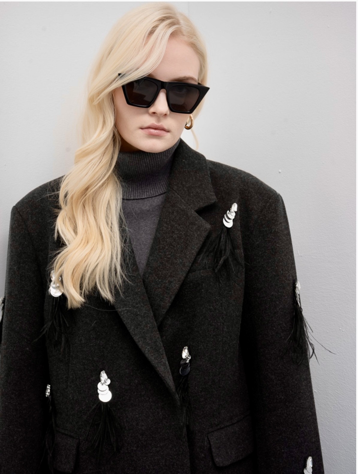 CAPPOTTO CON APPLICAZIONI GIOIELLO E PIUME