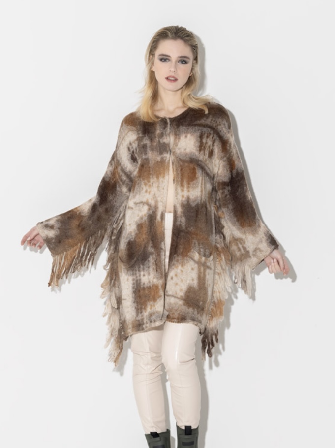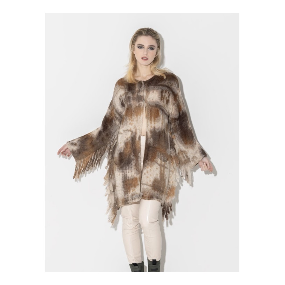 Cardigan in maglia misto lana e mohair dalla linea morbida, chiuso con bottoni e maniche lunghe con frange..