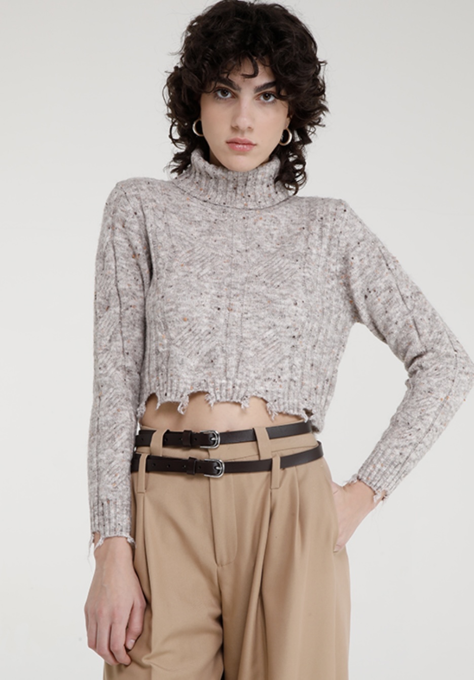 Il maglione Ref. MARETA è un capo di maglieria dal design moderno e audace, caratterizzato da un filato misto lana melange sale pepe che offre un effetto visivo ricco e variegato. Il collo alto aggiunge un tocco di eleganza e funzionalità, proteggendo dal freddo con stile. Il fondo del maglione presenta delle rotture deliberate, creando un effetto vissuto e trendy che aggiunge un elemento distintivo al capo. La vestibilità corta è perfetta per abbinamenti con pantaloni a vita alta o gonne, conferendo un look contemporaneo e raffinato.
