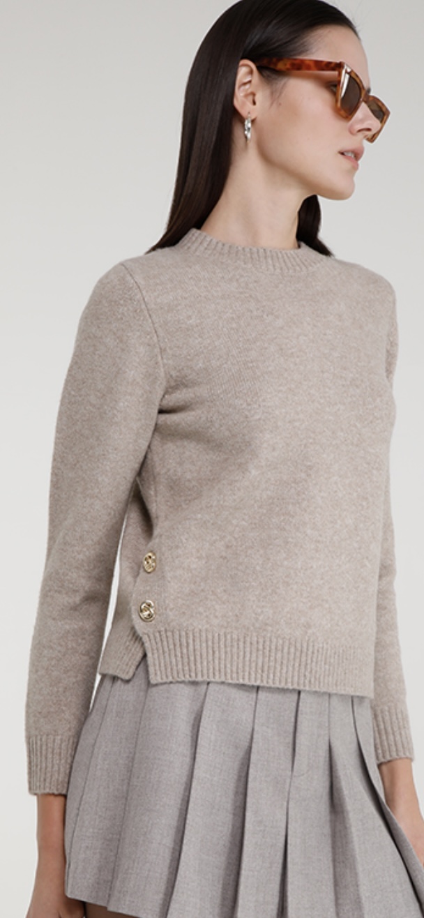 Il maglione in misto cashmere rif. MAITE è un capo pensato per offrire comfort e stile in ogni occasione. Realizzato con una pregiata miscela di cashmere, questo maglione garantisce una sensazione di morbidezza e calore ineguagliabile. Il design classico con girocollo e maniche lunghe è arricchito da raffinati bottoni gioiello applicati lungo i fianchi, che aggiungono un tocco di eleganza e femminilità. La vestibilità regolare lo rende perfetto da abbinare a qualsiasi look.