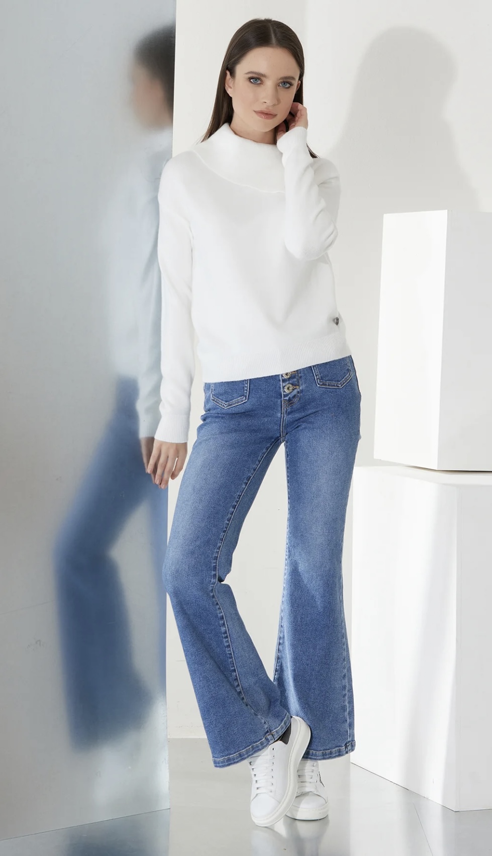 Maglia con collo alto aperto con dettaglio di quattro bottoncini gioiello, maniche lunghe