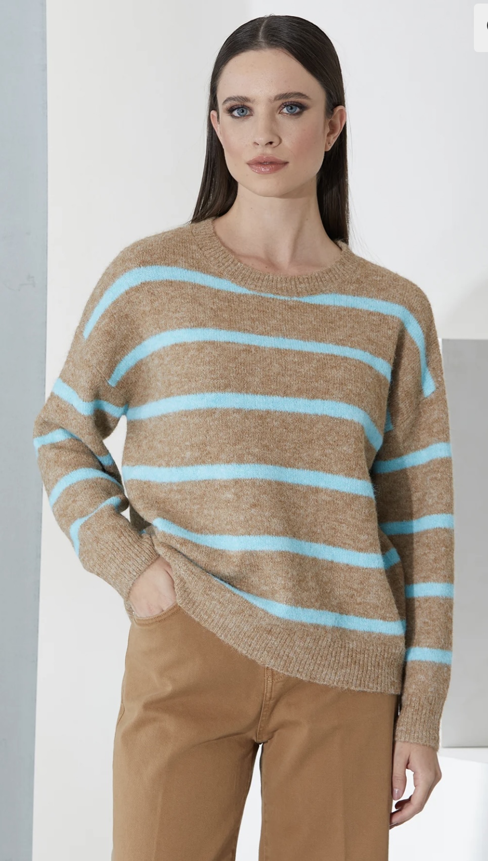 Maglia girocollo a righe in misto lana e alpaca offre una sensazione di avvolgente morbidezza sulla pelle.E uno dei tessuti piu' pregiatinel mondo dell'abbigliamento.. Linea morbida Scollo tondo, maniche lunghe Rifiniture a coste
