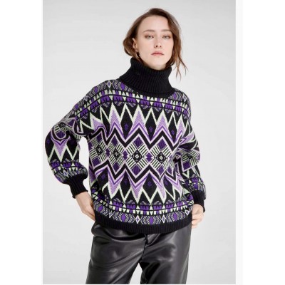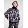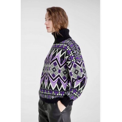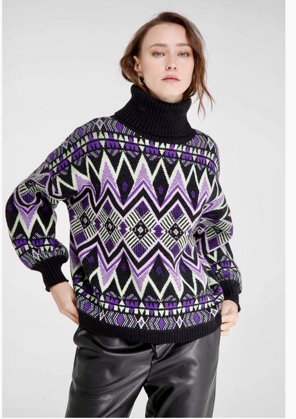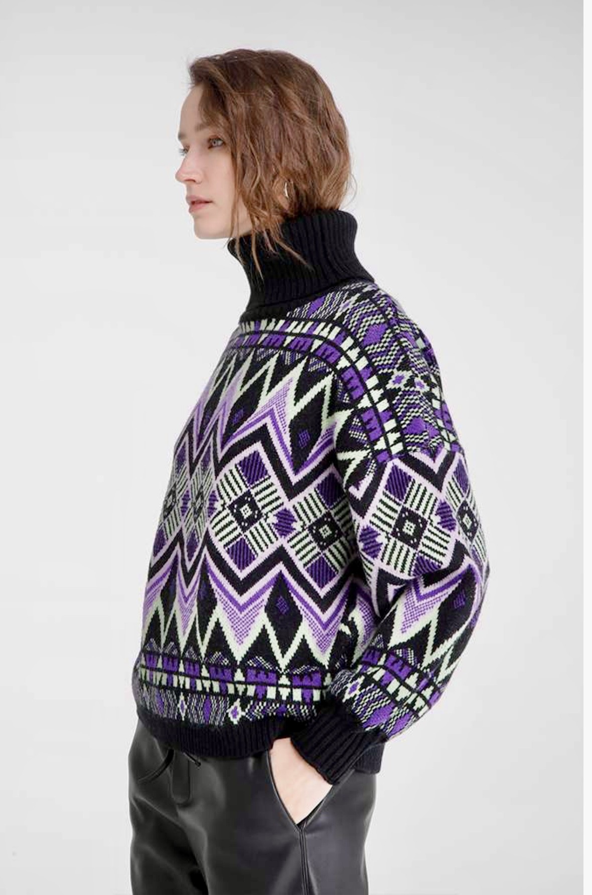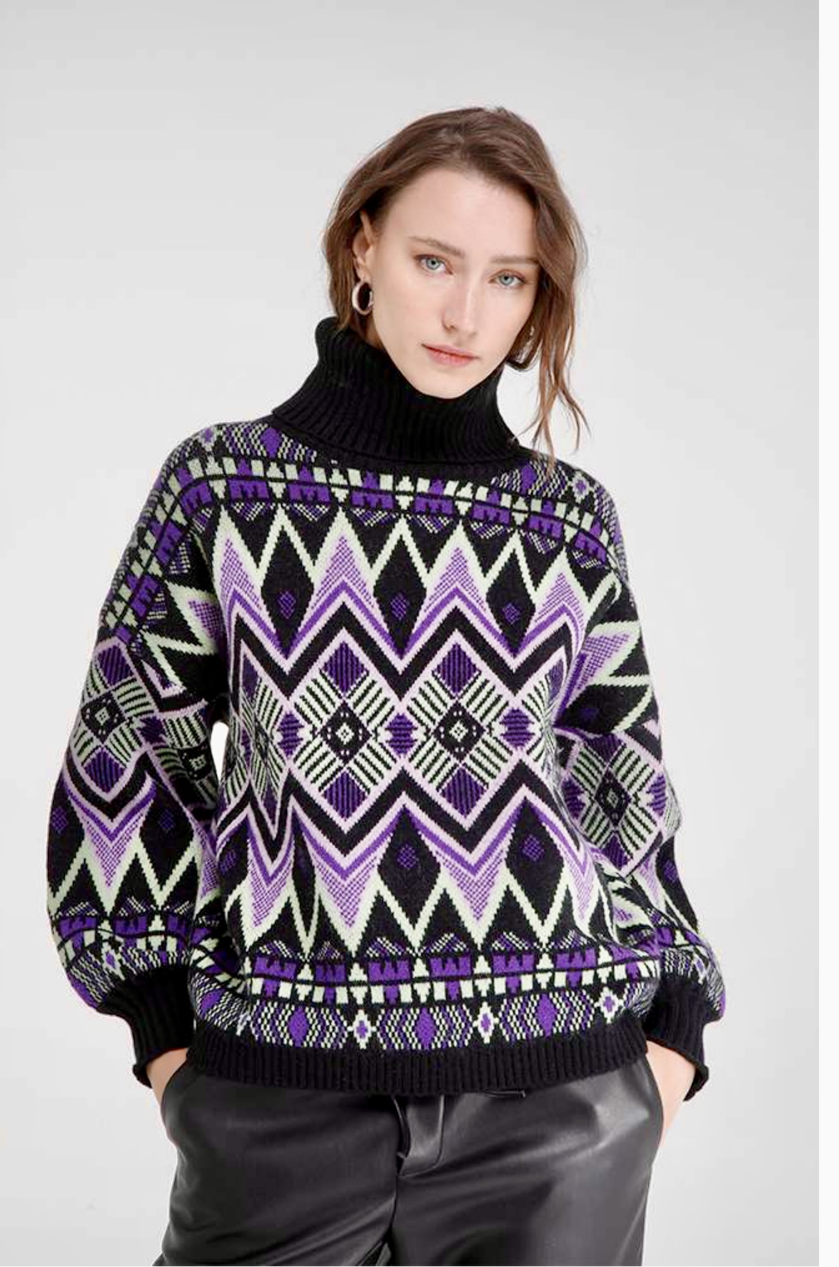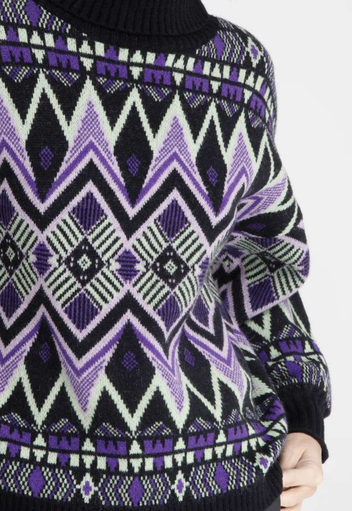 Il maglione Sparring è un capo verssatile di tendenza,perfetto oer affrontare la stagione fredda con stile.Realizzato in un caldo misto lana ,presenta un design jacquard con un vivace pattern geometriconei toni del viola,nero e verde.Il collo alto offre una protezione extra contro il freddo,mentre la vedstibilità oversize assicura comfort e libertà di movimento.