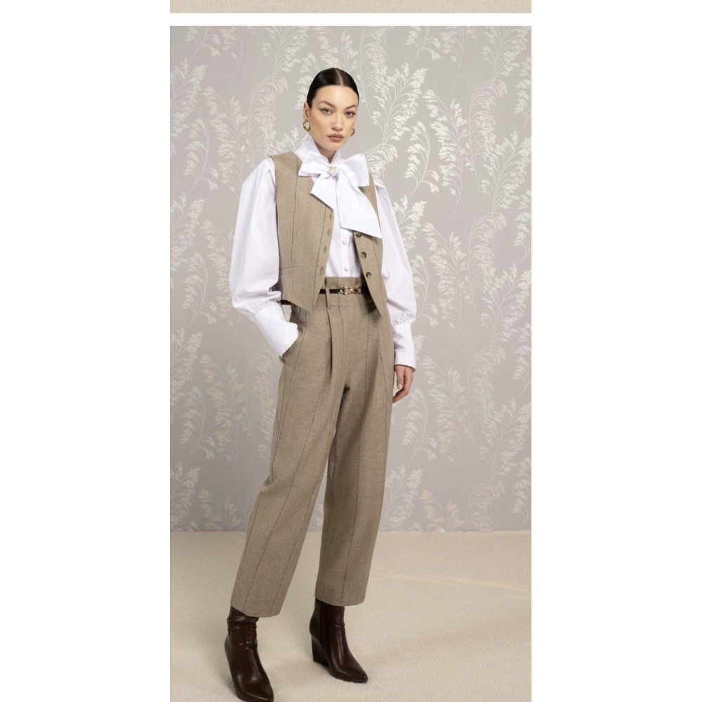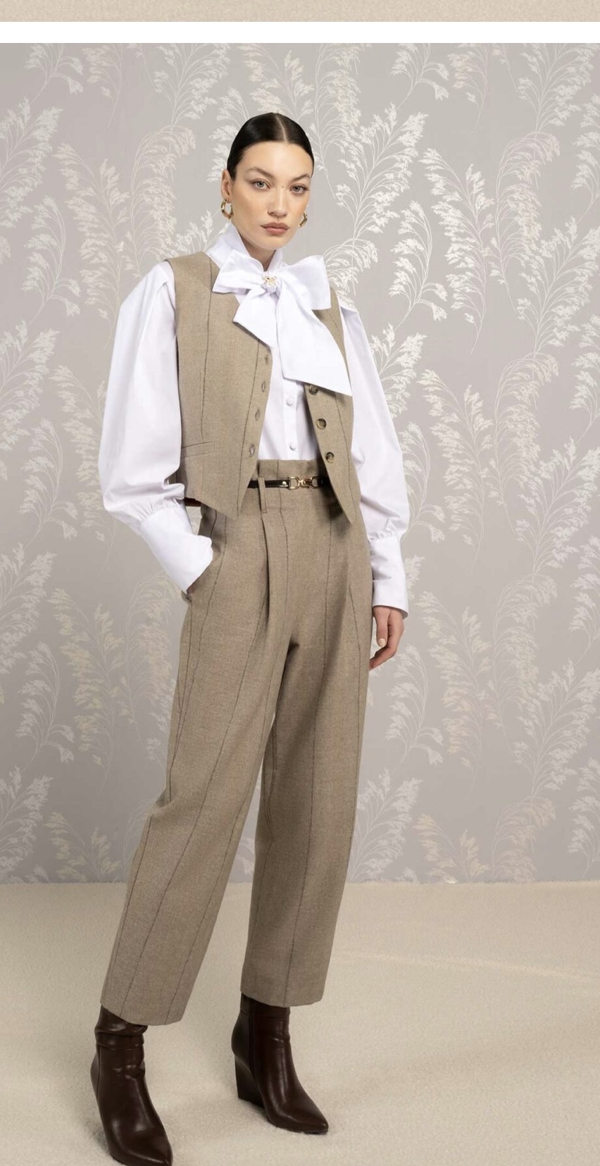 Linea wide leg con pinces, alto in vita con cinturina marrone e gangio in oro,
