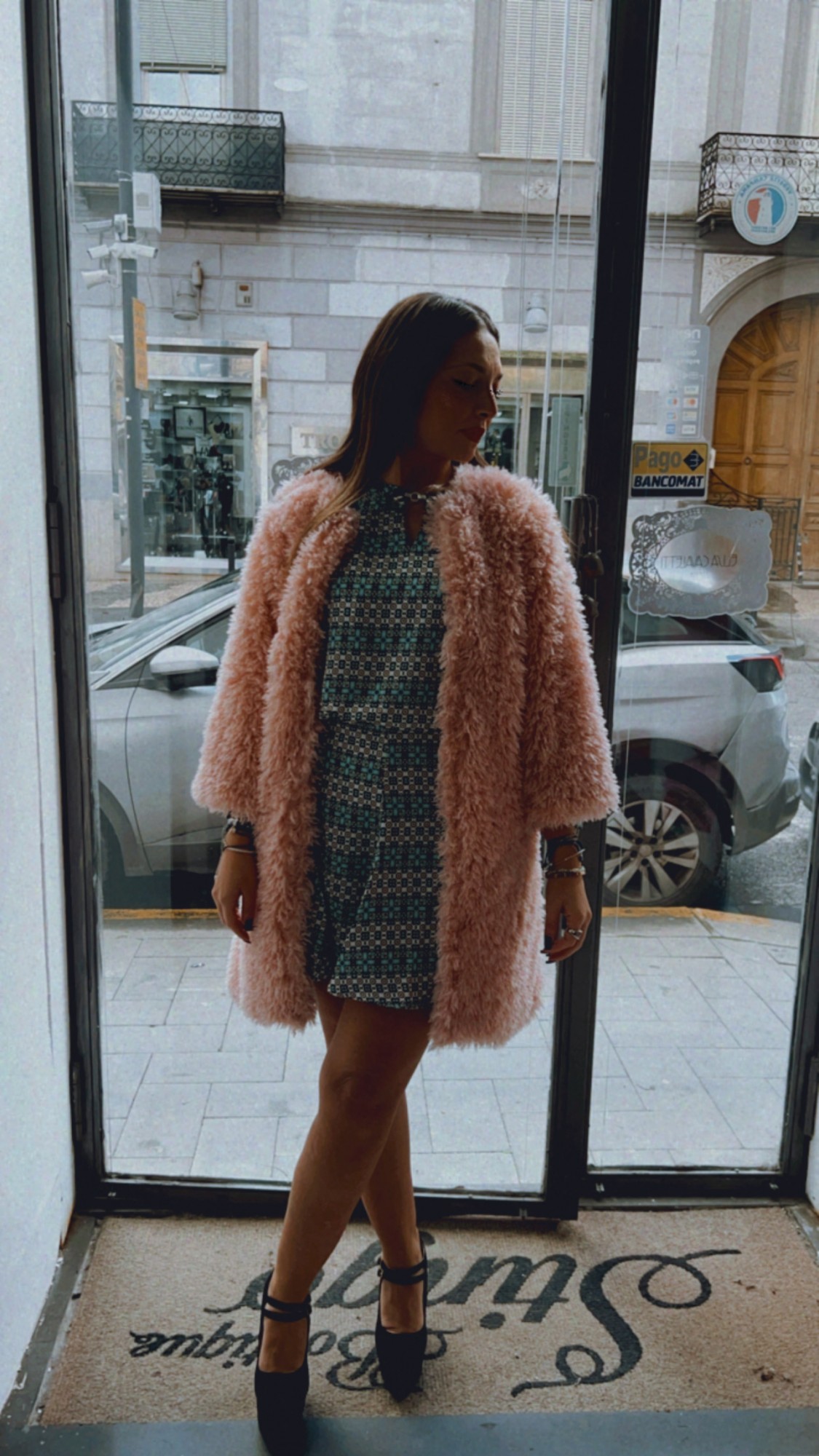 Pelliccia dalla vestibilità ampia in shearling ecologicasenza collo.Manica tre quarti chiusura frontale con ganci.