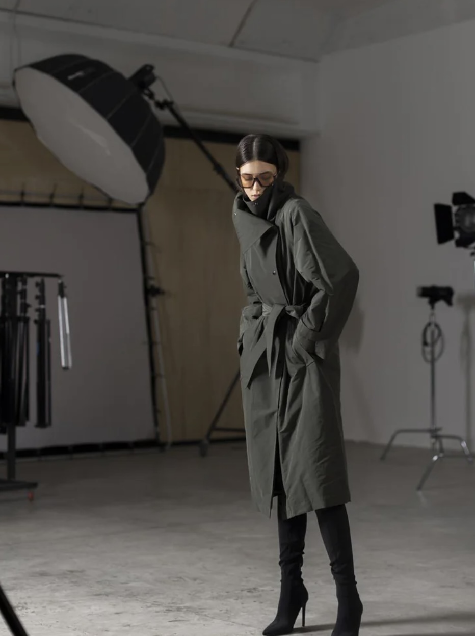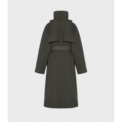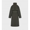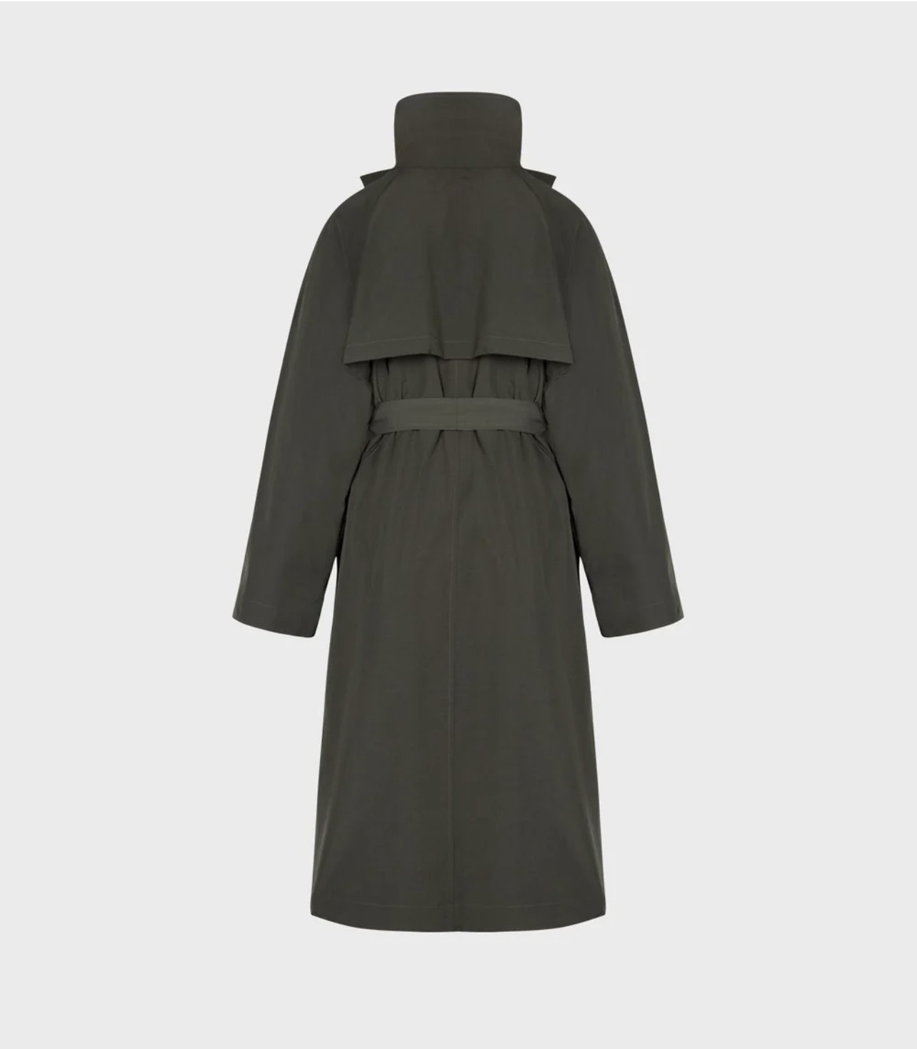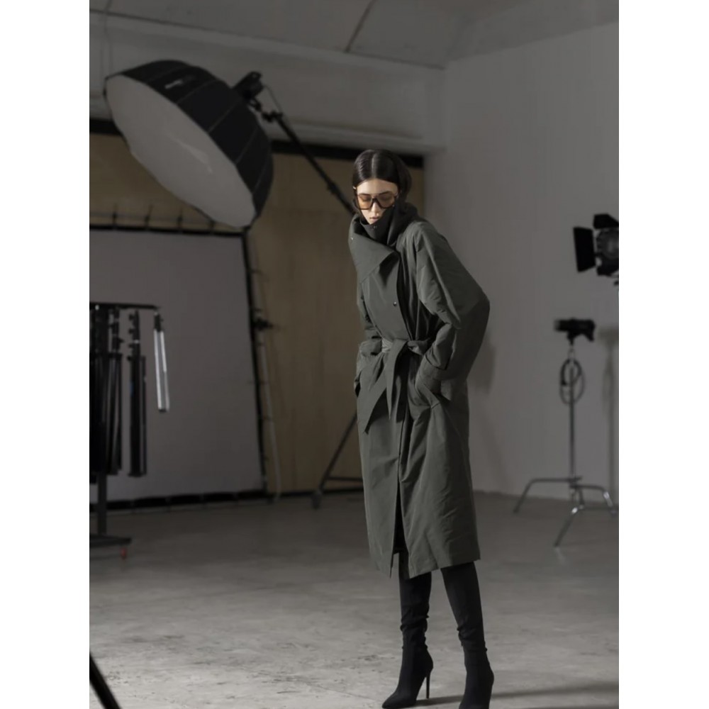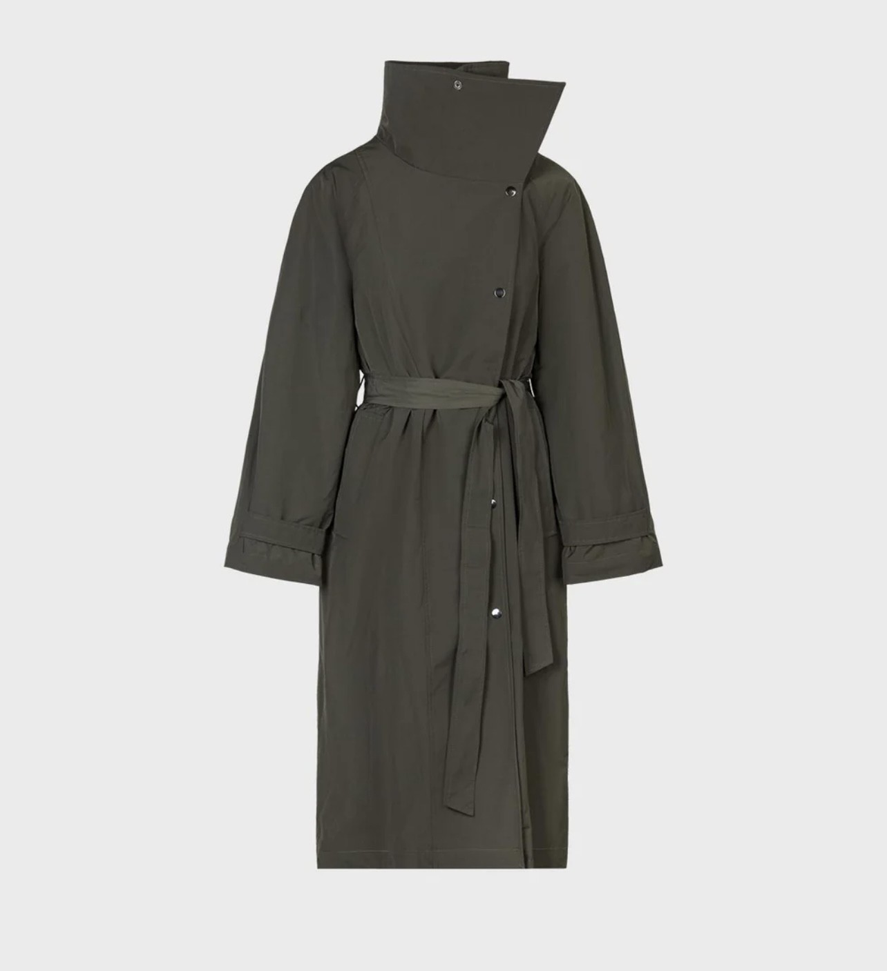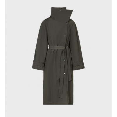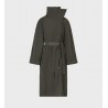 Trench in cotone/nylon con collo asimmetrico,bottoni automatici,cintura,taglio raglan e fodera trapuntata